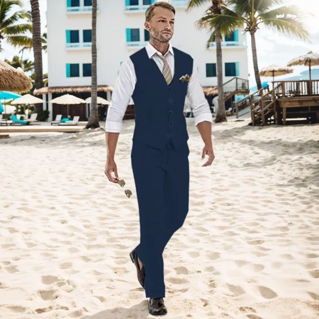 - Navy linen suit for weddings, which offers a more polished feel while remaining seasonally appropriate